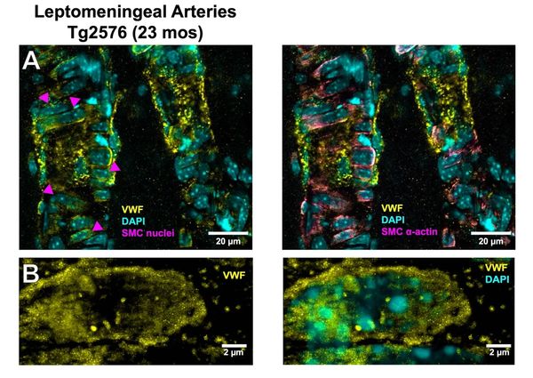 In this project, we are investigating the role of von Willebrand factor (VWF) in cerebrovascular remodeling. VWF is produced in endothelial cells and can be released from Weibel-Palade bodies into the blood as large multimers following endothelial cell activation. Release of VWF also occurs constitutively, delivering smaller multimers into the plasma and subendothelial space. While VWF is best known for its contribution to healthy hemostasis, recent data suggest that VWF may also function within the vascular wall (i.e. “intramural VWF”) to modify smooth muscle function. Our data show the presence of VWF within the vascular wall and in tight association with smooth muscle cells in both human and mouse brain vessels in aging, stroke, and amyloid-dependent pathology. We are currently examining the mechanisms by which intramural VWF promotes vascular remodeling and impaired vasomotor function of the leptomeningeal arteries/arterioles in human and mouse brain and determining if reducing intramural VWF can protect those vessels from pathological remodeling and impaired function.